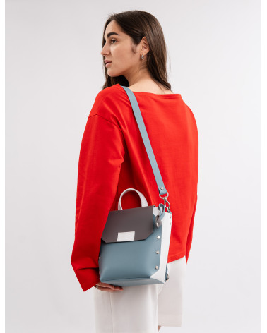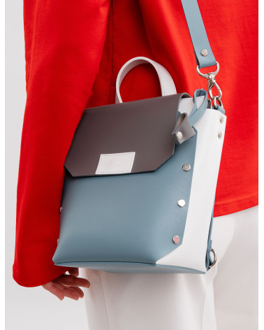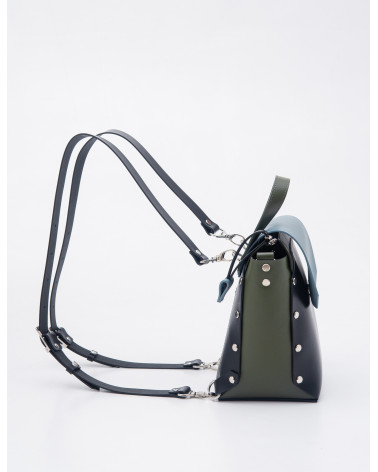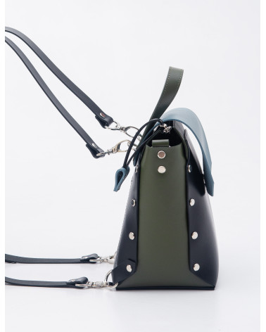 Корпус виготовлено зі шкіри українського виробництва. Основне відділення закривається на блискавку, кришку-клапан та магніт. Всередині рюкзака одне відділення та кишеня з фетру. Зовні рюкзак доповнено короткою ручкою, яка дозволяє носити його у руці. Також у комплекті є три довгі ручки. За допомогою широкої ручки зі щільної стрічки ви можете легко трансформувати рюкзак у сумку (для цього використовуються кріплення на бокових стінках рюкзака).Крім того, використовуючи дві інших ручки зі шкіри та кріплення на задній стінці рюкзака, ви можете носити його як рюкзак. Ці функції стають досить доречними у людних місцях.