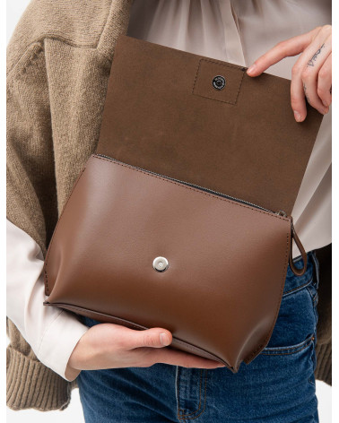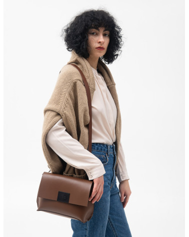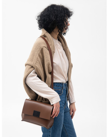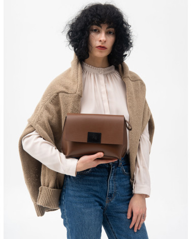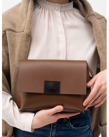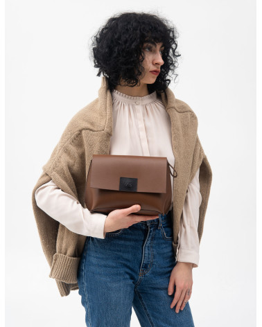 Корпус виготовлено зі шкіри українського виробництва. Основне відділення закривається на блискавку, кришку-клапан та магніт. Всередині сумочки одне відділення та кишеня з фетру для телефону, ключів, різних дрібничок. Бокові елементи сумочки виконані з менш щільної шкіри. Це дозволяє портфелю тримати форму з меншим та більшим наповненням. У комплекті є зйомна довга ручка.