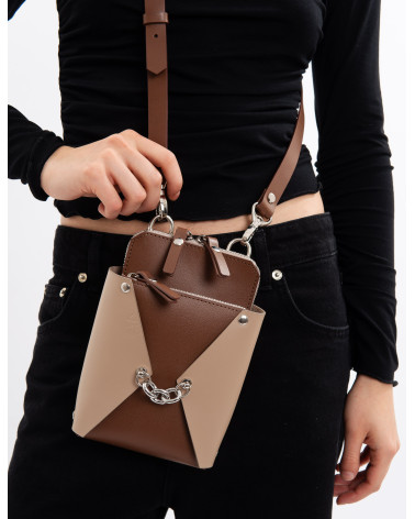 Корпус виготовлено зі шкіри українського виробництва. Основне відділення закривається на блискавку. Всередині сумочки одне відділення. Ззовні модель доповнено зручною кишенею на блискавці. Модель Талія:сумка створена, як варіація сумки для телефону. Тому, залежно від розміру вашого телефону, його можна зручно розміщувати у зовнішній кишені чи в основному відділенні сумки. У комплекті є довга зйомна ручка.