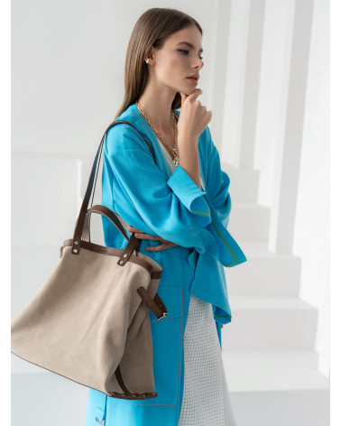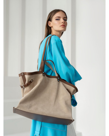 Корпус виготовлено з натуральної замші та доповнено шкірою українського виробництва. Основне відділення закривається на магніт. Всередині шопперу є зйомний гаманець-клатч, виготовлений також зі шкіри. Його можна використовувати як другу сумку, клатч, а також він допомагає швидко "переїжджати" із сумки в сумку.
